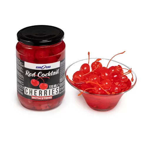 Деликатен и елегантен завршеток на крем, торта, коктел и какво и да е друго задоволство. Црешите се без семки и имаат многу пријатен ароматичен вкус! Црвените коктел вишни со дршки често се користат во слаткарството за украсување на колачи, давајќи им уште попрефинет изглед. Сега се достапни во пакување од 720 mL, подготвени за употреба во слатките креации.